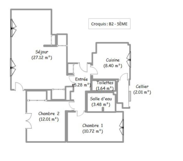 - La répartition: Séjour Double, cuisine avec cellier, 2 chambres, salle d'eau,wc